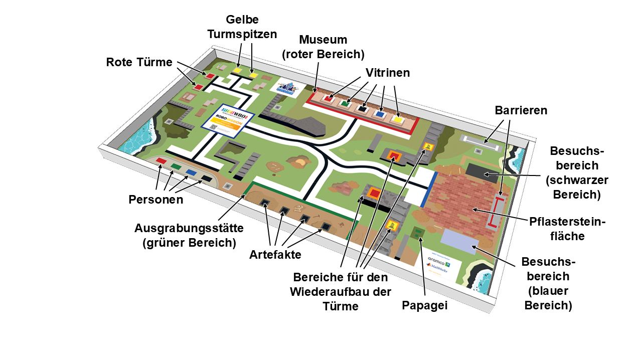 Expertinnen und Experten verschiedenster Fachgebiete arbeiten gemeinsam daran, dieses wichtige Erben zu schützen und setzten dabei Roboter ein. Der Roboter eures Teams wird in das Festungsgelände geschickt, um Besucherinnen und Besucher zu führen, kaputte Türme wieder aufzubauen, wichtige Wege zu säubern und wertvolle Artefakte vorsichtig ins Museum zu transportieren.